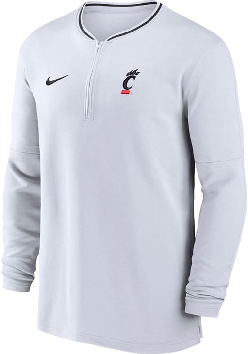 Embrace the warmth and showcase your Bearcats pride with our Cincinnati Bearcats Long Sleeve Qtr Zip Pullover. This Mens White Sideline DriFIT Half Zip Gameday Long Sleeve Pullover offers a embroidered team graphic on left chest for the perfect combination of comfort and style. Elevate your everyday look with this must-have Cincinnati Bearcats Long Sleeve Qtr Zip Pullover.