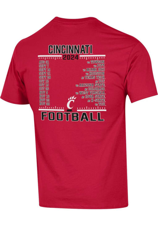 Display your team spirit with this remarkable Cincinnati Bearcats Champion Red 2024 Football Schedule Short Sleeve T Shirt! The Cincinnati Short Sleeve Tee showcases a screenprint of team name and logo across chest and football schedule on back that truly sets it apart. Stand out from the crowd and proudly declare your allegiance to the Bearcats with this exceptional Red Cincinnati T Shirt. Go Bearcats!!