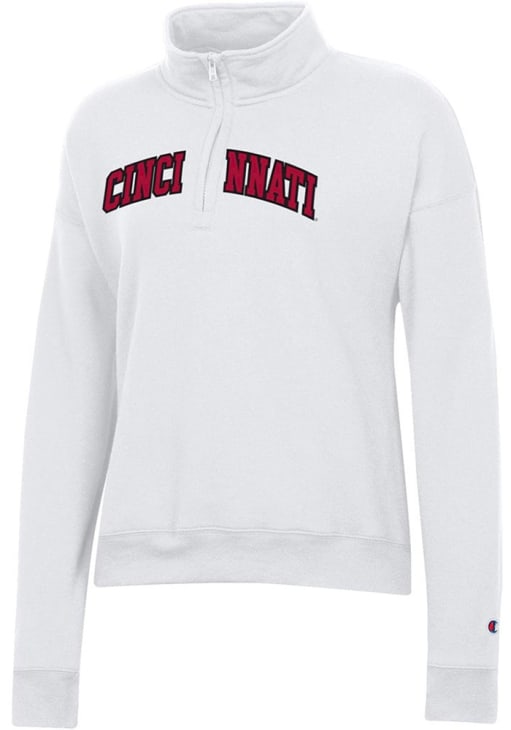 Embrace the warmth and showcase your Bearcats pride with our Cincinnati Bearcats Long Sleeve Qtr Zip. This Womens White Twill Long Sleeve Pullover offers a applique team name on center chest for the perfect combination of comfort and style. Elevate your everyday look with this must-have Cincinnati Bearcats Long Sleeve Qtr Zip.