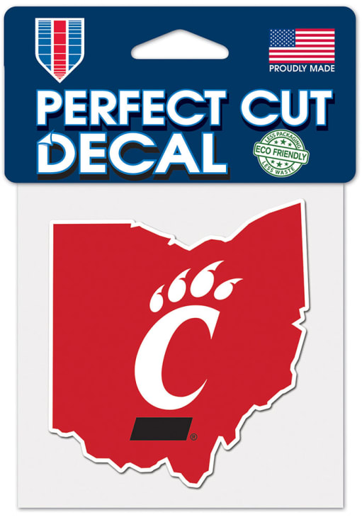 Product Details Product Details 4" X 4" colored logoMade of outdoor vinyl and permanent adhesiveImage cut to the outside dimension of logoFull color detail is printed with a 3-year outdoor ratingComes with a clear liner, transfer tape, and application instructionsVinylUSA Officially Licensed This Bearcats Decal features a team logo in a team color state shape background.