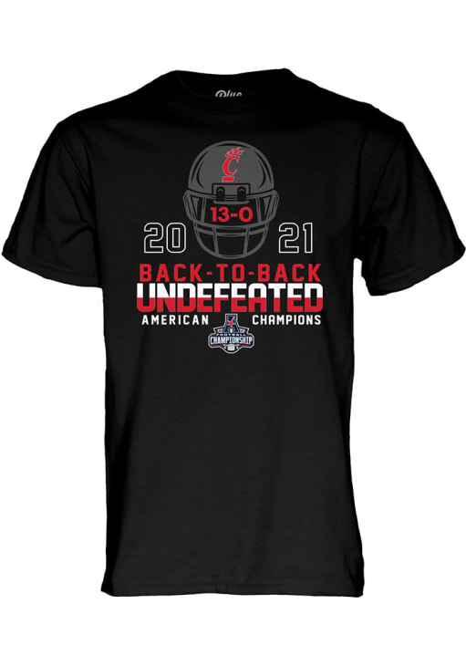Display your team spirit with this remarkable Cincinnati Bearcats Blue 84 Black 2021 AAC Undefeated Champions Short Sleeve T Shirt! The Cincinnati Short Sleeve Tee showcases a screen print Cincinnati Bearcats Football 2021 Undefeated American Athletic Conference on front chest that truly sets it apart. Stand out from the crowd and proudly declare your allegiance to the Bearcats with this exceptional Black Cincinnati T Shirt. Go Bearcats!!