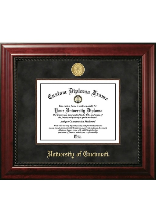 Product Details Product Details Black suede matMahogany filet linerPremium wood moulding22-kt. gold-plated medallionIncludes dual hangers and a leveling kit Officially Licensed Cincinnati Bearcats Executive Diploma Frame is a great way to keep your Bearcats memories close. You'll love looking at your favorite Bearcats moments with this Diploma Frame, which features a premium hardwood frame. Go Bearcats!!