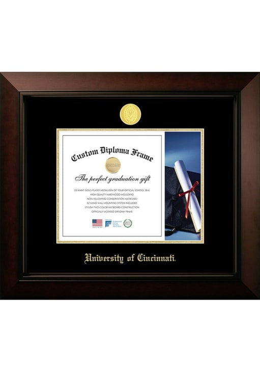 Product Details Product Details 22-kt. gold-plated medallionSchool name stamped in gold foilAcid-free matboardPremium wood mouldingIncludes dual hangers and a leveling kit Officially Licensed Cincinnati Bearcats Legacy Diploma Frame is a great way to keep your Bearcats memories close. You'll love looking at your favorite Bearcats moments with this Diploma Frame, which features a black cherry satin frame. Go Bearcats!!