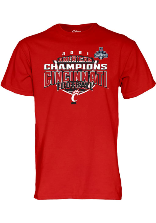Display your team spirit with this remarkable Cincinnati Bearcats Blue 84 Red 2021 AAC Champions Short Sleeve T Shirt! The Cincinnati Short Sleeve Tee showcases a screen print of Cincinnati Bearcats Football 2021 AAC Football Conference Champions official locker roomg graphic on front chest that truly sets it apart. Stand out from the crowd and proudly declare your allegiance to the Bearcats with this exceptional Red Cincinnati T Shirt. Go Bearcats!!