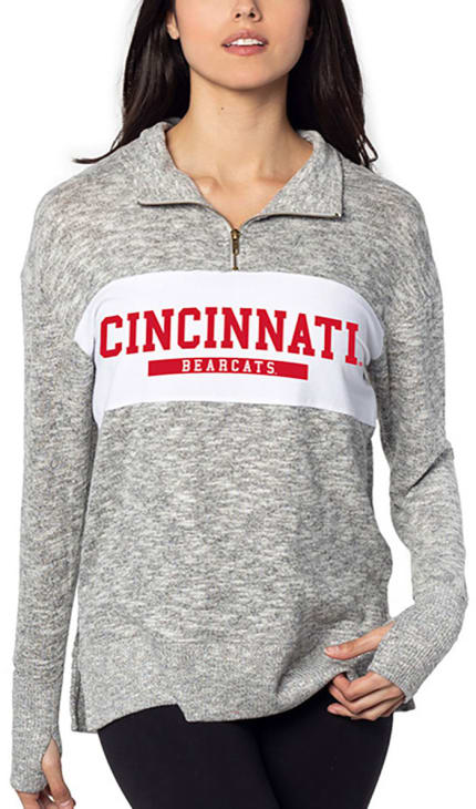 Embrace the warmth and showcase your Bearcats pride with our Cincinnati Bearcats Long Sleeve Qtr Zip. This Womens Grey Soft Touch Cozy Style Long Sleeve Pullover offers a screen print team name on center chest for the perfect combination of comfort and style. Elevate your everyday look with this must-have Cincinnati Bearcats Long Sleeve Qtr Zip.