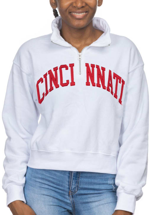 Embrace the warmth and showcase your Bearcats pride with our Cincinnati Bearcats Long Sleeve Qtr Zip. This Womens White Cropped Sport Fleece Long Sleeve Pullover offers a applique team name on center chest for the perfect combination of comfort and style. Elevate your everyday look with this must-have Cincinnati Bearcats Long Sleeve Qtr Zip.