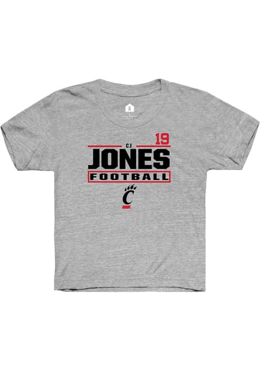 Kids, support your favorite player in this Youth Grey Cincinnati Bearcats Cj Jones Short Sleeve Player Tee! This Player T-Shirt features a NIL graphic, so Cj Jones can feel your team spirit! This is a perfect Youth Player T-Shirt to wear either everyday or on game day. Go Bearcats!!