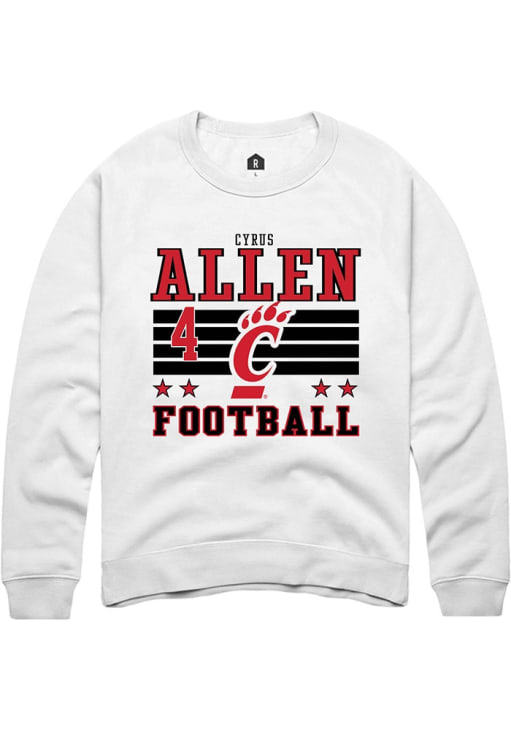 Support your Cincinnati Bearcats and favorite Cyrus Allen in this Cincinnati Bearcats Mens White Football NIL Striped Player Crew. This Crew Sweatshirt features a NIL graphic, and is sure to stand out in the stadium. Perfect to wear on game day or any day!