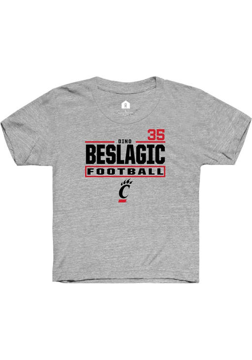 Kids, support your favorite player in this Youth Grey Cincinnati Bearcats Dino Beslagic Short Sleeve Player Tee! This Player T-Shirt features a NIL graphic, so Dino Beslagic can feel your team spirit! This is a perfect Youth Player T-Shirt to wear either everyday or on game day. Go Bearcats!!