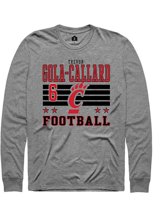 Embrace the spirit of your favorite player in this Cincinnati Bearcats Grey Football NIL Striped Trevon Gola-Callard Long Sleeve Player Tee! This Player T Shirt features a NIL graphic, so everyone will know you cheer for Cincinnati, Trevon Gola-Callard! This is the perfect Bearcats Player Tee for game days. Go Bearcats!!