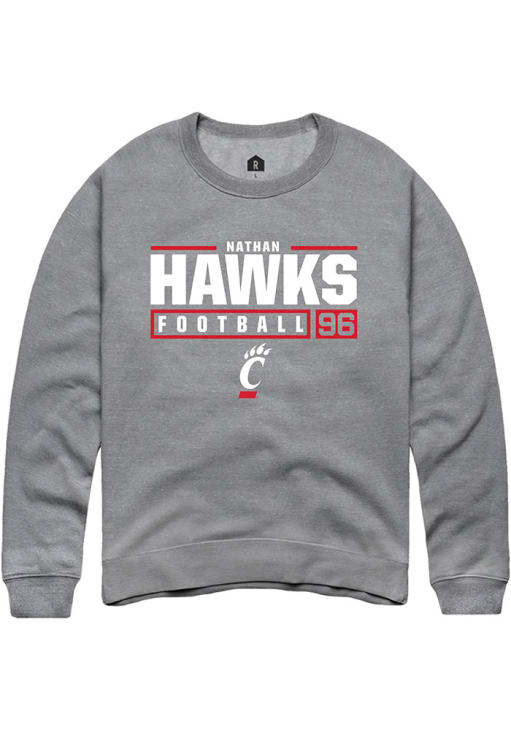 Support your Cincinnati Bearcats and favorite Nathan Hawks in this Cincinnati Bearcats Mens Graphite NIL Stacked Box Player Crew. This Crew Sweatshirt features a custom graphic with player's name and number, and is sure to stand out in the stadium. Perfect to wear on game day or any day!