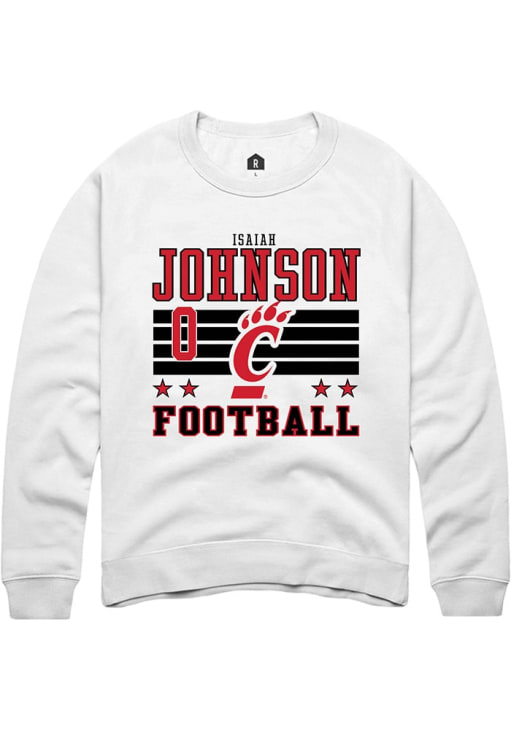 Support your Cincinnati Bearcats and favorite Isaiah Johnson in this Cincinnati Bearcats Mens White Football NIL Striped Player Crew. This Crew Sweatshirt features a NIL graphic, and is sure to stand out in the stadium. Perfect to wear on game day or any day!
