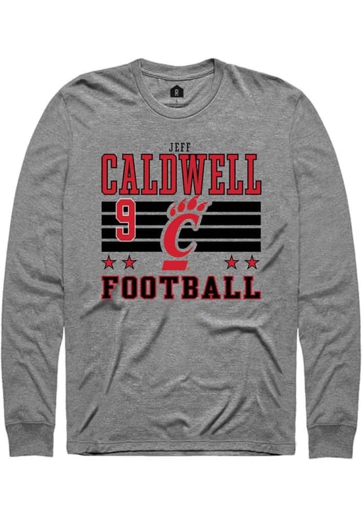 Embrace the spirit of your favorite player in this Cincinnati Bearcats Grey Football NIL Striped Jeff Caldwell Long Sleeve Player Tee! This Player T Shirt features a NIL graphic, so everyone will know you cheer for Cincinnati, Jeff Caldwell! This is the perfect Bearcats Player Tee for game days. Go Bearcats!!