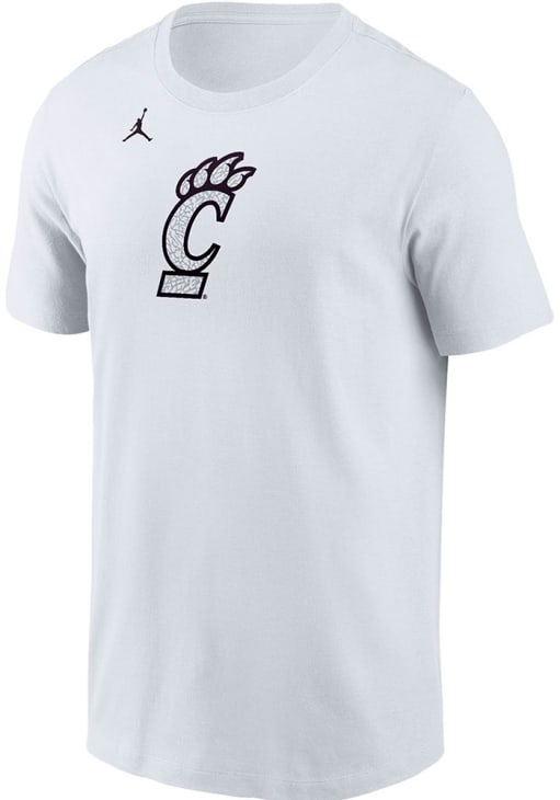 Display your team spirit with this remarkable Cincinnati Bearcats Nike White Jordan Basketball Pattern Team Logo Short Sleeve T Shirt! The Cincinnati Short Sleeve Tee showcases a screenprinted of team graphic on front chest with Jordan logo that truly sets it apart. Stand out from the crowd and proudly declare your allegiance to the Bearcats with this exceptional White Cincinnati T Shirt. Go Bearcats!!