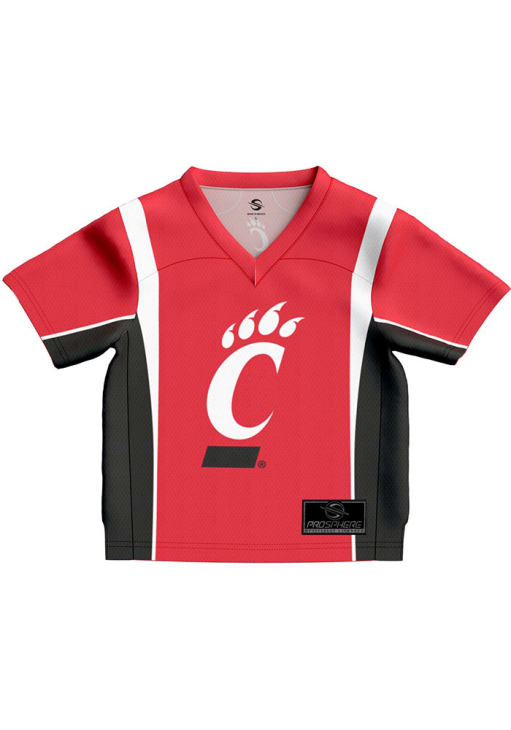 Product Details Product Details Stitched jock tag at bottom left hemScreen-print front and back numbersTagless collar with interior tapingClean-finished internal seamsStandard fit: not too tight and not too looseFit: True to Size100% POLYESTERMachine wash coldImported Officially Licensed Every young Cincinnati fan needs a Baby Red Cincinnati Bearcats Football Jersey! This Cincinnati Jersey features a screenprint number on front with team name and number on back. Dress up your little Bearcats for gameday!