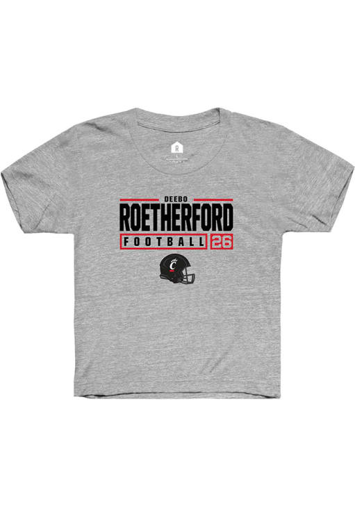 Deebo Roetherford Rally Youth Grey Cincinnati Bearcats NIL Stacked Box Short Sleeve T-Shirt