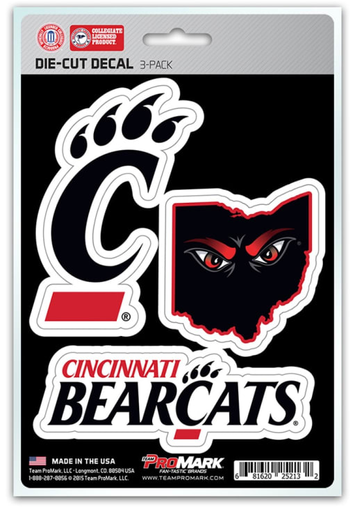 Product Details Product Details 3 adhesive decals includedDie-cut, premium vinyl materialUV resistantApprox. 5" x 7.5"VINYLImported Officially Licensed This Bearcats Decal features a 3-pack of decals, including a primary team logo, wordmark, and alternate team logo.
