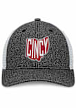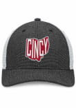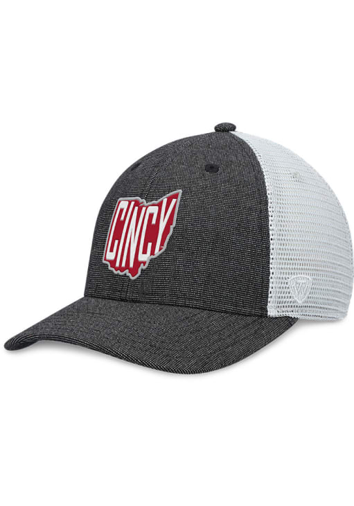 Product Details Product Details State shape patch with team name fill on center crownHeathered cotton crown and visorWoven team logo labelSnap closureTOW side logoCOTTON/POLY MESHCurved BillHigh CrownStructuredWipe clean with cloth or cleaning kitImported Officially Licensed This Black Bearcats Adjustable Hat features a front state shape with team name inside on a heathered crown and visor with back trucker mesh.