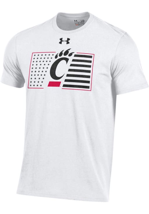 Display your team spirit with this remarkable Cincinnati Bearcats White Military Apreciation Short Sleeve T Shirt! The Cincinnati Short Sleeve Tee showcases a screen print of US flag with team logo on front chest that truly sets it apart. Stand out from the crowd and proudly declare your allegiance to the Bearcats with this exceptional White Cincinnati T Shirt. Go Bearcats!!
