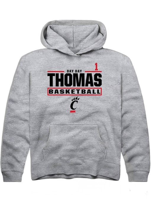 Day Day Thomas Rally Youth Grey Cincinnati Bearcats NIL Stacked Box Long Sleeve Hooded Sweatshirt