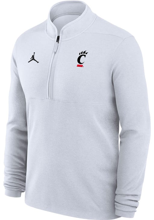 Embrace the warmth and showcase your Bearcats pride with our Cincinnati Bearcats Long Sleeve Qtr Zip Pullover. This Mens White Jordan Victory Long Sleeve Pullover offers a team logo on left chest and Jumpman on right chest for the perfect combination of comfort and style. Elevate your everyday look with this must-have Cincinnati Bearcats Long Sleeve Qtr Zip Pullover.